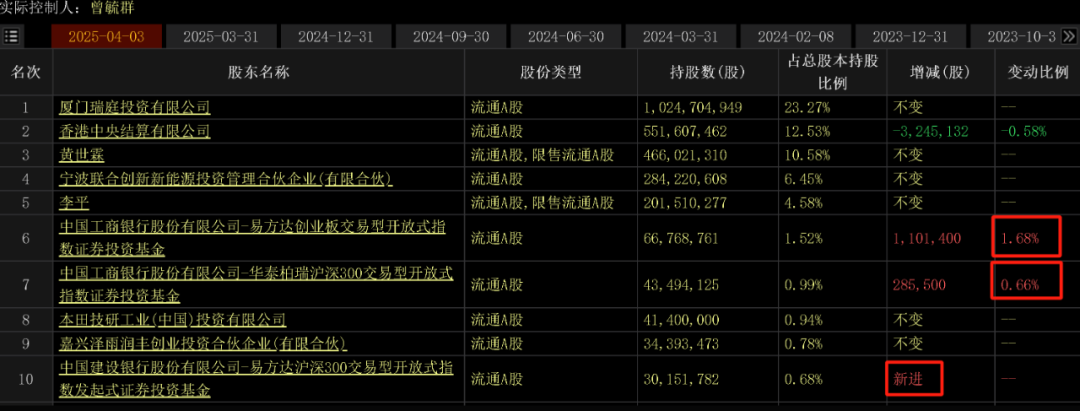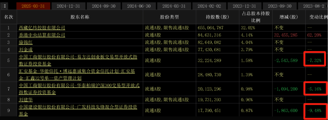 2025年一季度数据显示,亿纬锂能前十大股东中,有多只公募基金在进行减持。