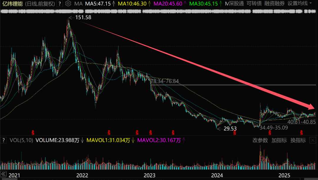 跟宁德时代股价走势相比,亿纬锂能最近几年就差多了。两家公司都是2021年底股价见顶,跟历史最高点比,目前宁德时代下跌约20%,亿纬锂能则是暴跌近70%。
